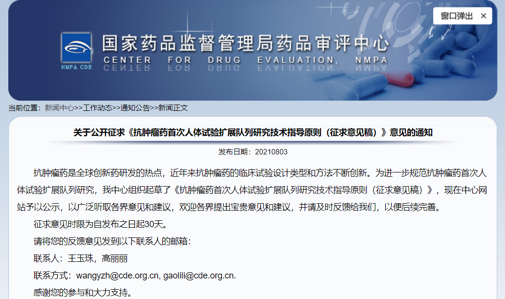 關于公開征求《抗腫瘤藥首次人體試驗擴展隊列研究技術指導原則(征求意見稿)》意見的通知