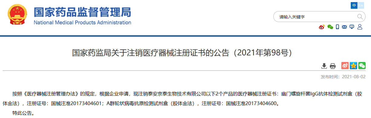 關于注銷醫療器械注冊證書的公告(2021年第98號)