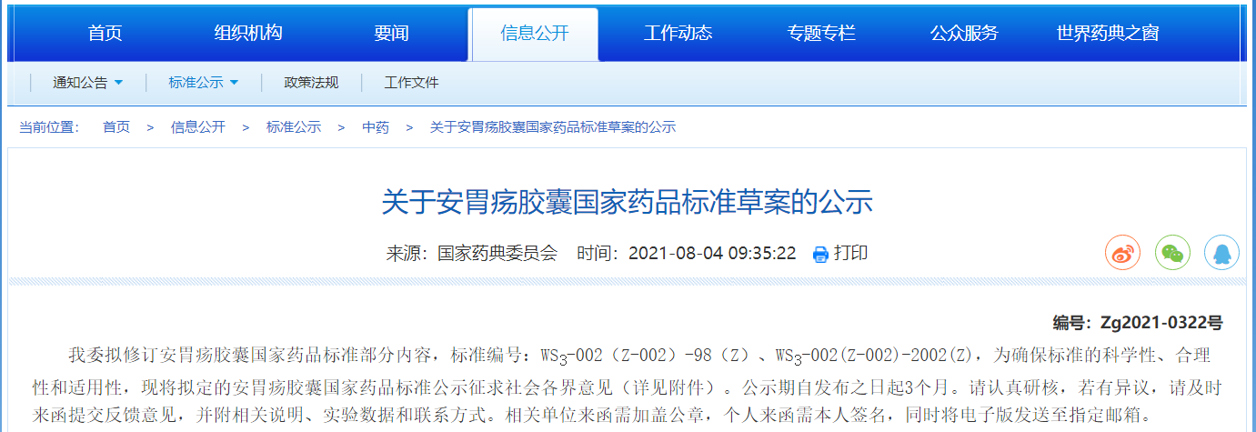 關于安胃瘍膠囊國家藥品標準草案的公示