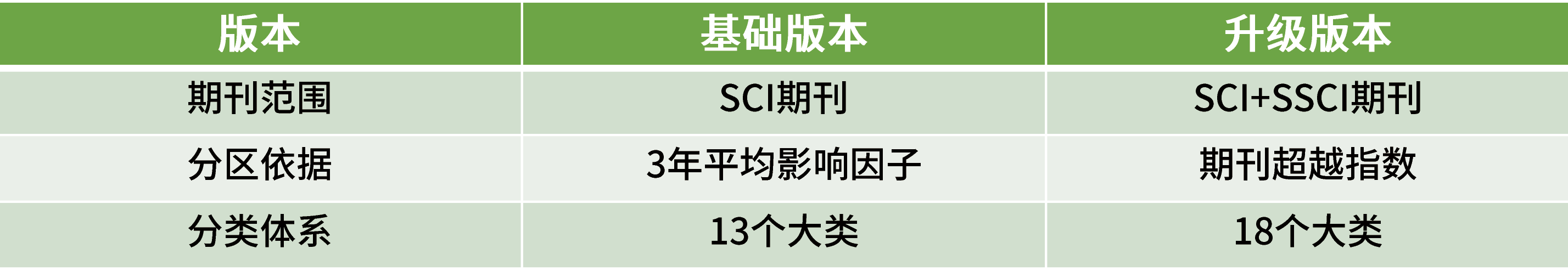 最流行是的中科院的分區(qū)。從2020年,分區(qū)依據由原來的影響因子換成超越指數,這種分區(qū)方法將經歷2019-2021三年的過渡期,由原來的13大類變成了18大類,如下圖所示。