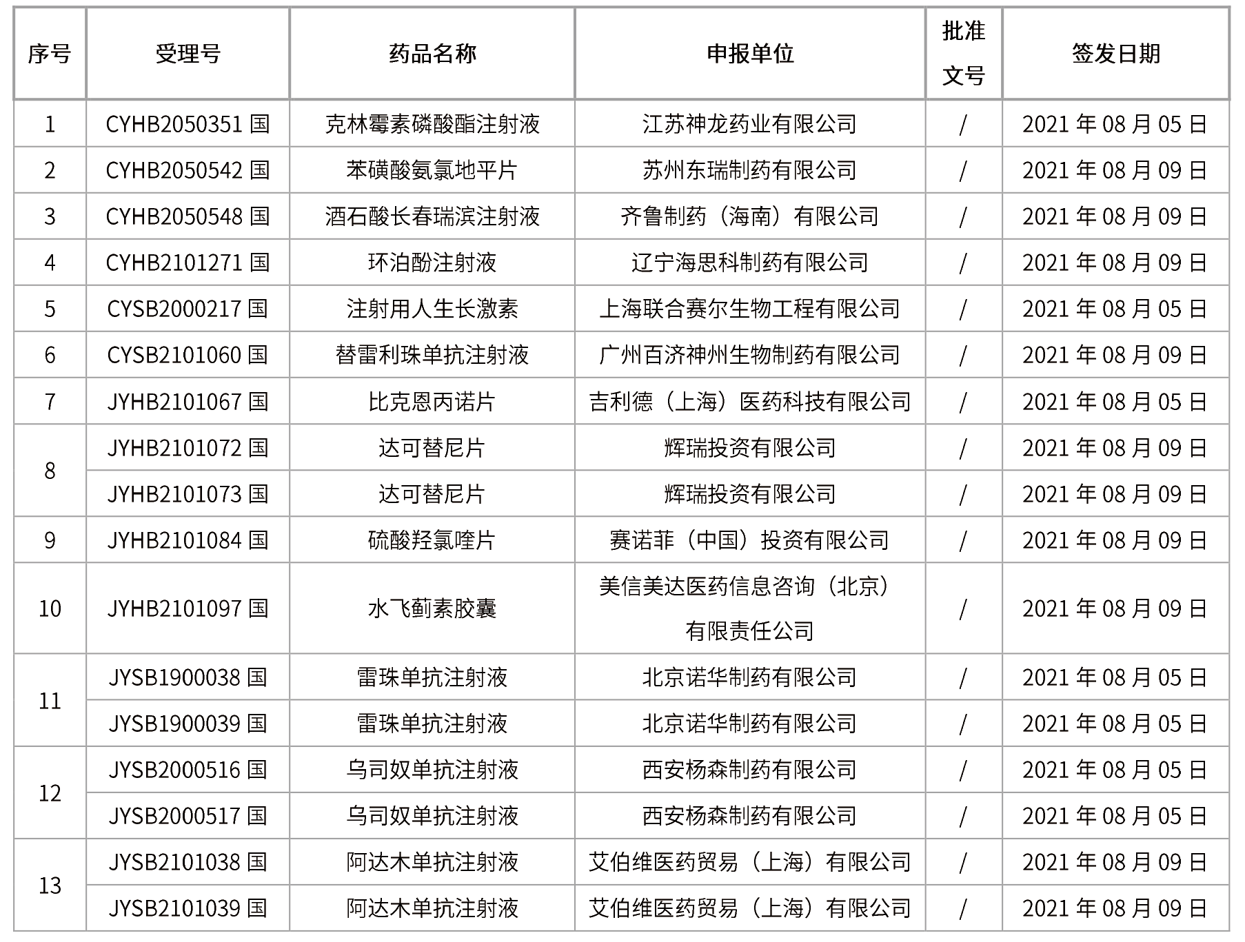 1. 本周共計(jì)13個(gè)品種取得藥品批準(zhǔn)證明文件,其中一致性評(píng)價(jià)品種3個(gè),包括注射劑品種2個(gè)。