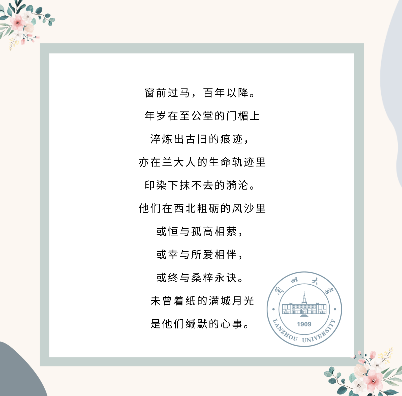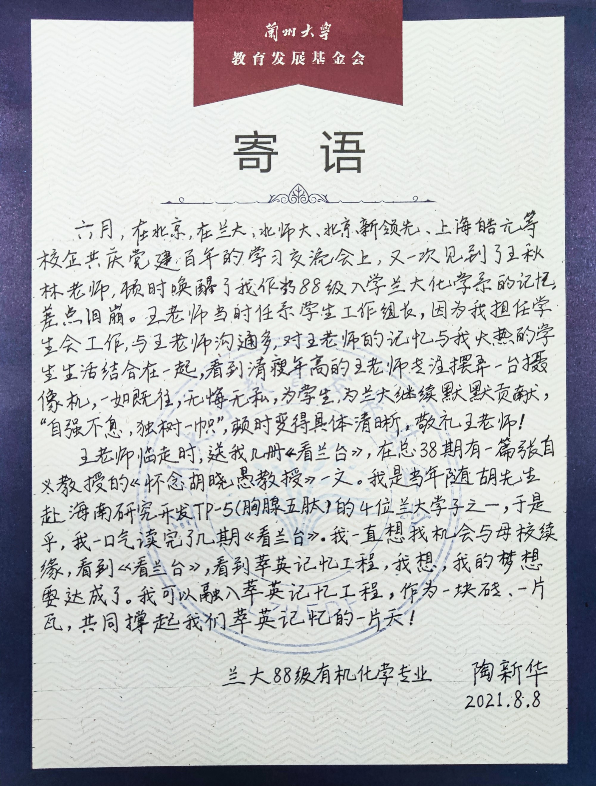 陶總談到,在蘭大求學(xué)的四年間,正是世界觀和人生觀重塑的階段,在母校“自強(qiáng)不息、獨(dú)樹一幟”的校風(fēng)校訓(xùn)的熏陶下,養(yǎng)成了獨(dú)立思考的人格和不屈的奮斗精神,在人生漫長的歲月中,無論身在何處、境遇如何,母校永遠(yuǎn)是一個(gè)取之不盡用之不竭的力量源泉。追憶學(xué)校經(jīng)歷,陶總還特別感謝了給予他人生指引和生活幫助的老師和同學(xué)們,讓他度過了令人懷念的大學(xué)時(shí)光。飲水思源,我們深切感謝母校的培育,也密切關(guān)注母校的建設(shè)和發(fā)展,呼吁更多的蘭大學(xué)子為母校貢獻(xiàn)綿薄之力!
