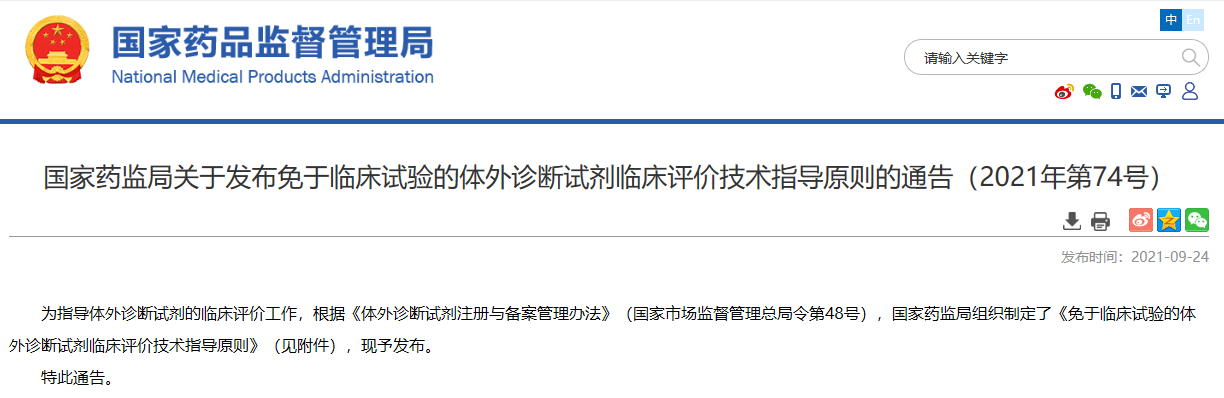關于發(fā)布免于臨床試驗的體外診斷試劑臨床評價技術指導原則的通告(2021年第74號)