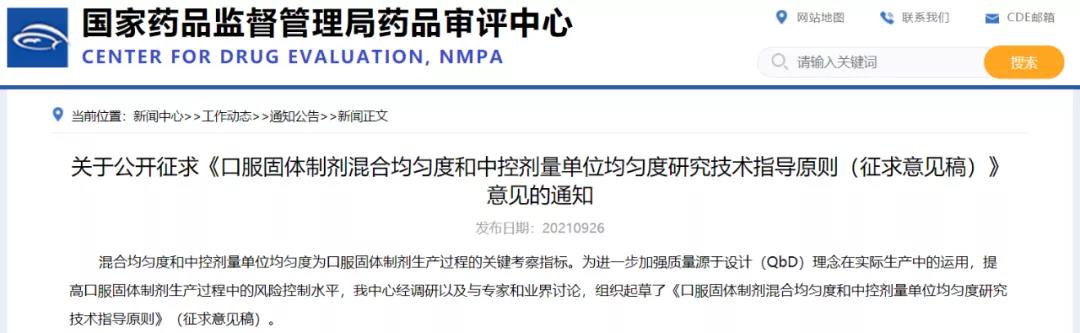 關(guān)于公開(kāi)征求《口服固體制劑混合均勻度和中控劑量單位均勻度研究技術(shù)指導(dǎo)原則(征求意見(jiàn)稿)》意見(jiàn)的通知