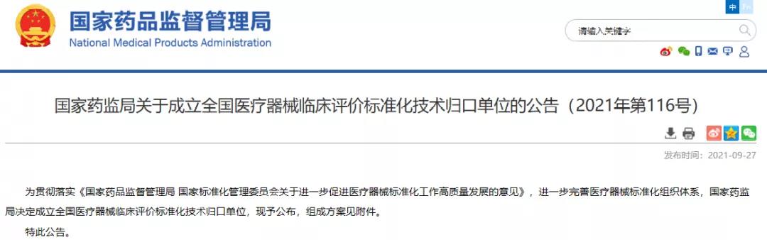 國(guó)家藥監(jiān)局關(guān)于成立全國(guó)醫(yī)療器械臨床評(píng)價(jià)標(biāo)準(zhǔn)化技術(shù)歸口單位的公告(2021年第116號(hào))
