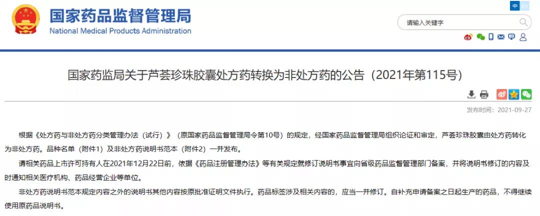 國(guó)家藥監(jiān)局關(guān)于蘆薈珍珠膠囊處方藥轉(zhuǎn)換為非處方藥的公告(2021年第115號(hào))