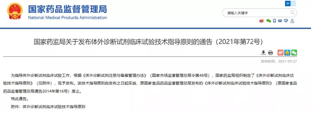 國(guó)家藥監(jiān)局關(guān)于發(fā)布體外診斷試劑臨床試驗(yàn)技術(shù)指導(dǎo)原則的通告(2021年第72號(hào))