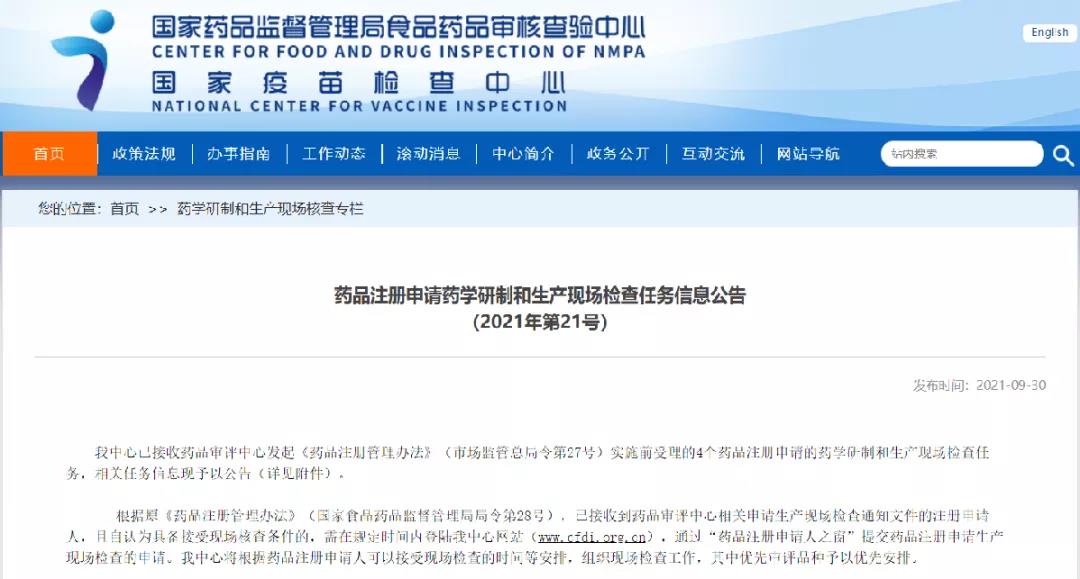 藥品注冊(cè)申請(qǐng)藥學(xué)研制和生產(chǎn)現(xiàn)場(chǎng)檢查任務(wù)信息公告(2021年第21號(hào))