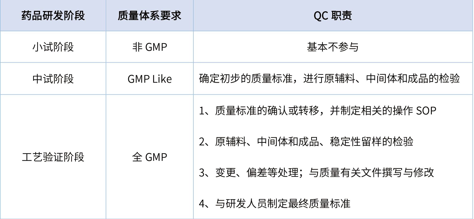 從藥品研發開始至批準上市,按GMP體系運行要求,可分為非GMP階段、GMP Like階段和全GMP階段,QC人員需參與的具體工作見表1。