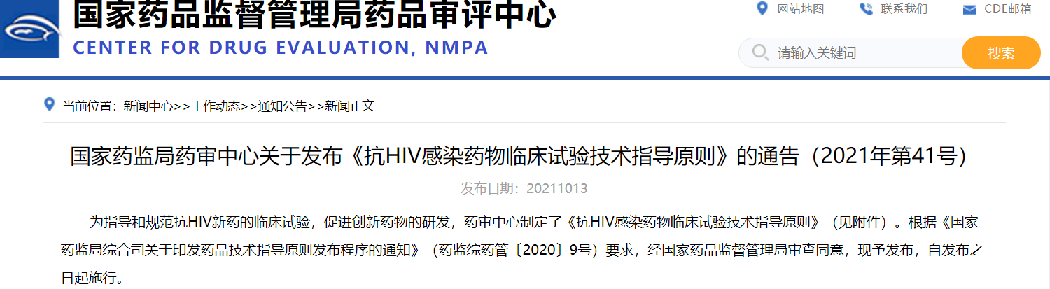 國家藥監(jiān)局藥審中心關(guān)于發(fā)布《抗HIV感染藥物臨床試驗(yàn)技術(shù)指導(dǎo)原則》的通告(2021年第41號(hào))