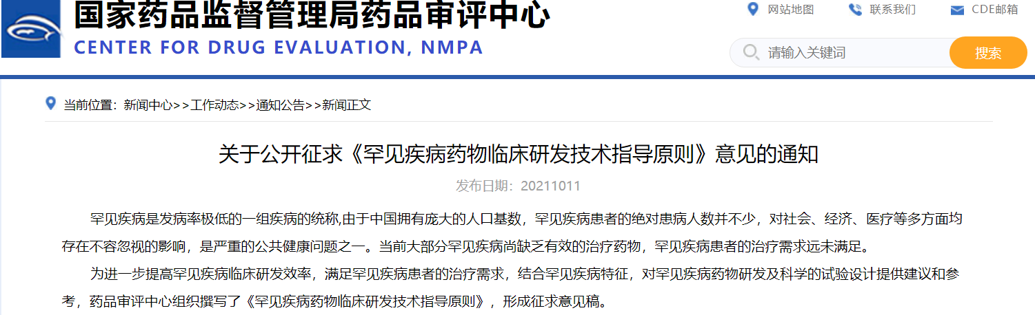 關(guān)于公開征求《罕見疾病藥物臨床研發(fā)技術(shù)指導(dǎo)原則》意見的通知