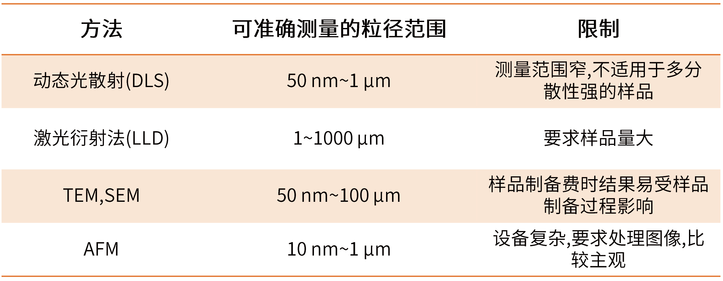 粒徑及粒徑分布是影響微球制劑釋放行為的關鍵因素,其對緩釋微球的包封率、釋放行為模式、降解速率都有一定影響,因此粒徑大小及分布是質量控制中一個很重要的指標。隨著檢測手段的進步,粒徑大小及其分布測定由傳統的光學顯微鏡視野測定發展到電子顯微鏡的逐一統計再發展到近年來應用廣泛的激光粒度儀繪制粒徑大小分布圖,可以在制備過程中的每一步工藝里對粒徑大小及分布進行追蹤檢測進而得到目標微球,表1介紹了各種方法的特點。