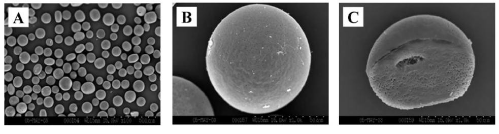 (A)全視圖 (B)單個微球表面圖 (C)單個微球切面圖