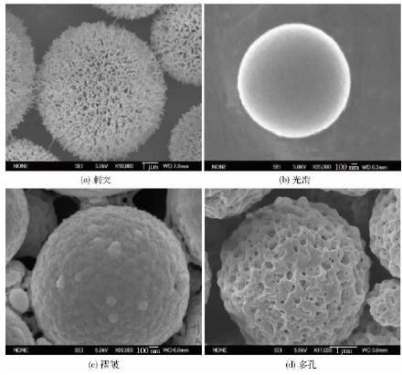 SEM是目前觀察微球形態使用最廣泛的方法,被用于表面及切面形態的觀察(見圖2)。TEM 分辨率高,圖像為二級結構平面,適用于亞微球、納米球粒徑測定。此外還有原子力學顯微鏡(atomic force microscopy,AFM)可用于觀察微球形態,AFM 優點之一是分辨率高,與 SEM 相比,不需要對樣品進行金屬噴鍍,避免了噴鍍后對樣品的表面形態造成的破壞,并且AFM 允許在液態環境下觀測樣品,而 SEM 則不行。但是 AFM 缺點是觀察范圍窄,得到數據不具有統計性,適合單個粒子表面形態的觀察。