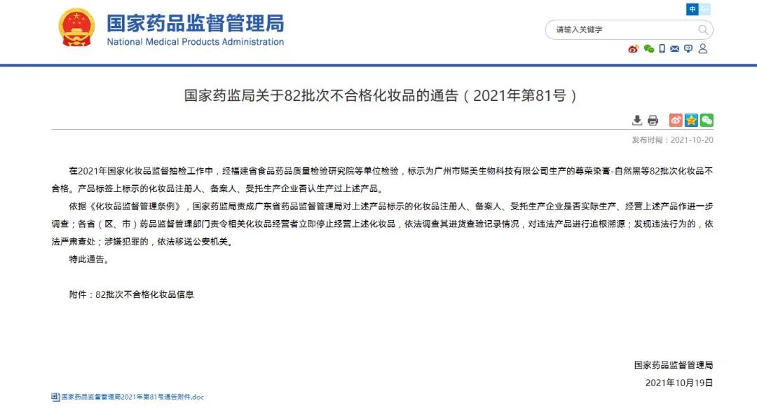 國(guó)家藥監(jiān)局關(guān)于82批次不合格化妝品的通告(2021年第81號(hào))