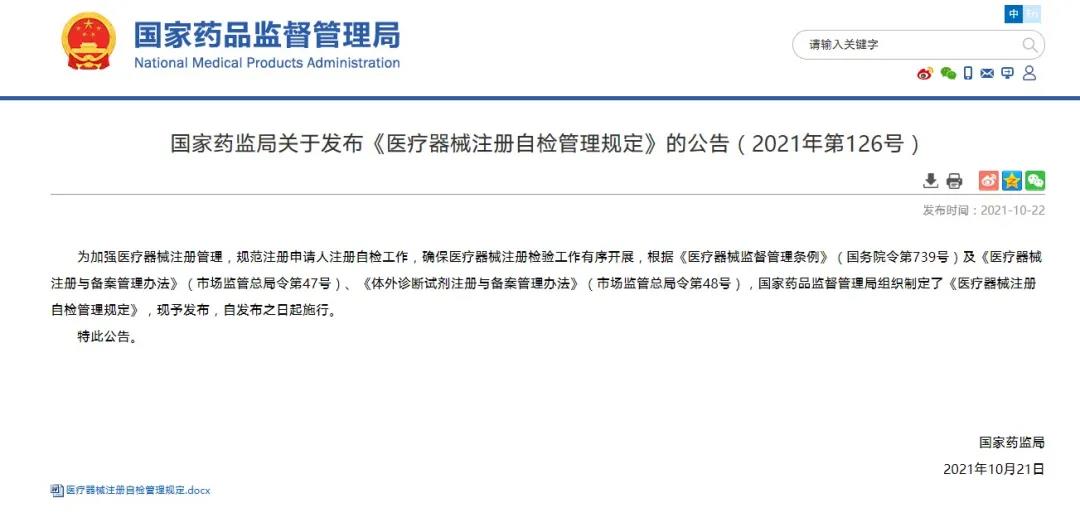 國(guó)家藥監(jiān)局關(guān)于發(fā)布《醫(yī)療器械注冊(cè)自檢管理規(guī)定》的公告(2021年第126號(hào))