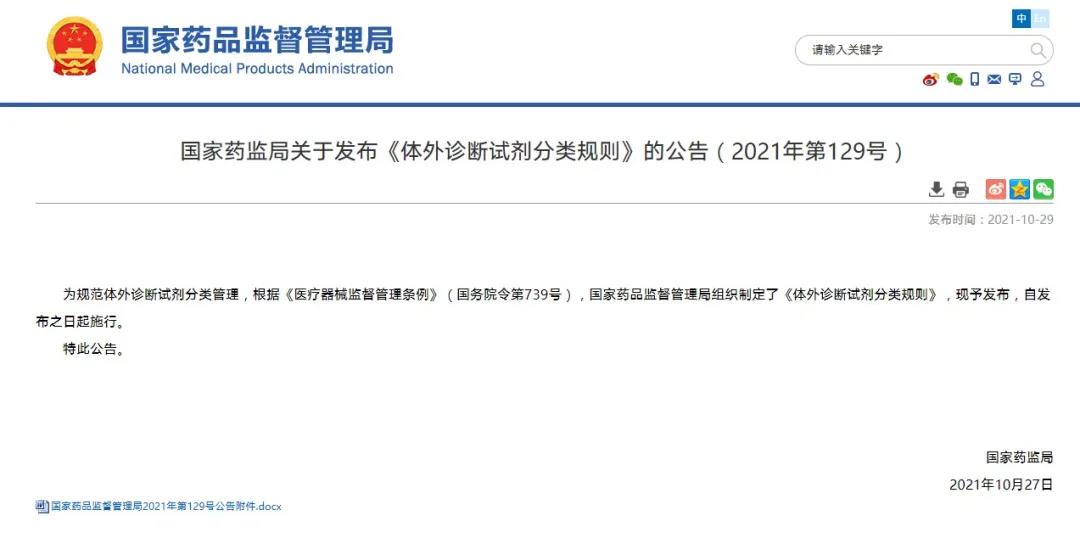國家藥監局關于發布《體外診斷試劑分類規則》的公告(2021年第129號)