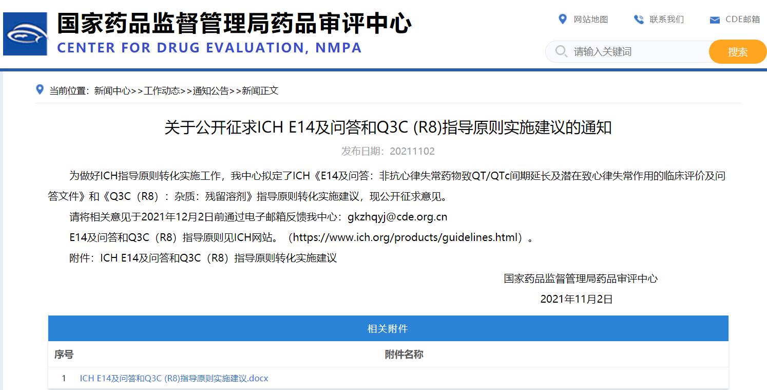 關于公開征求ICH E14及問答和Q3C (R8)指導原則實施建議的通知