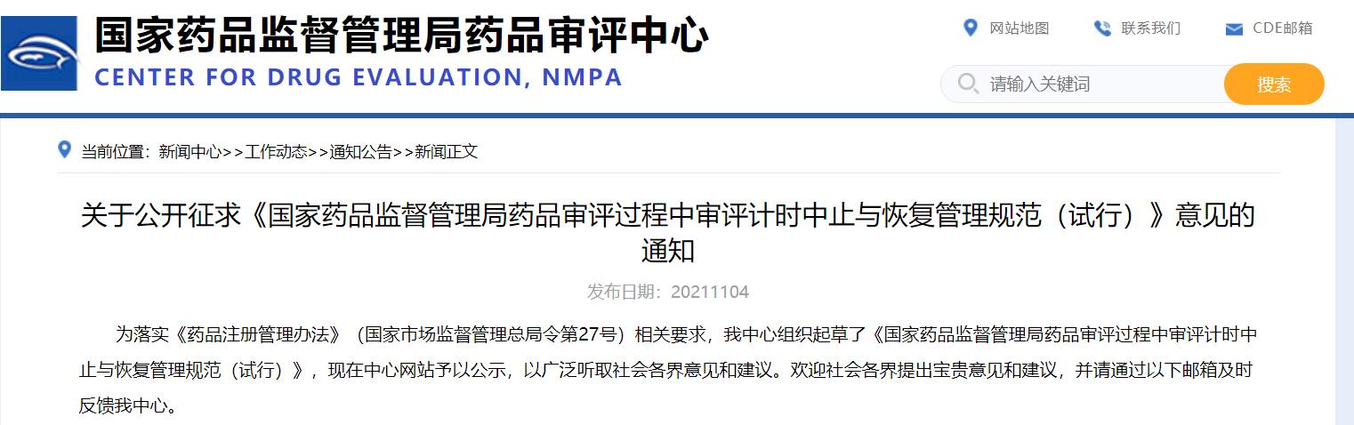 關于公開征求《國家藥品監督管理局藥品審評過程中審評計時中止與恢復管理規范(試行)》意見的通知