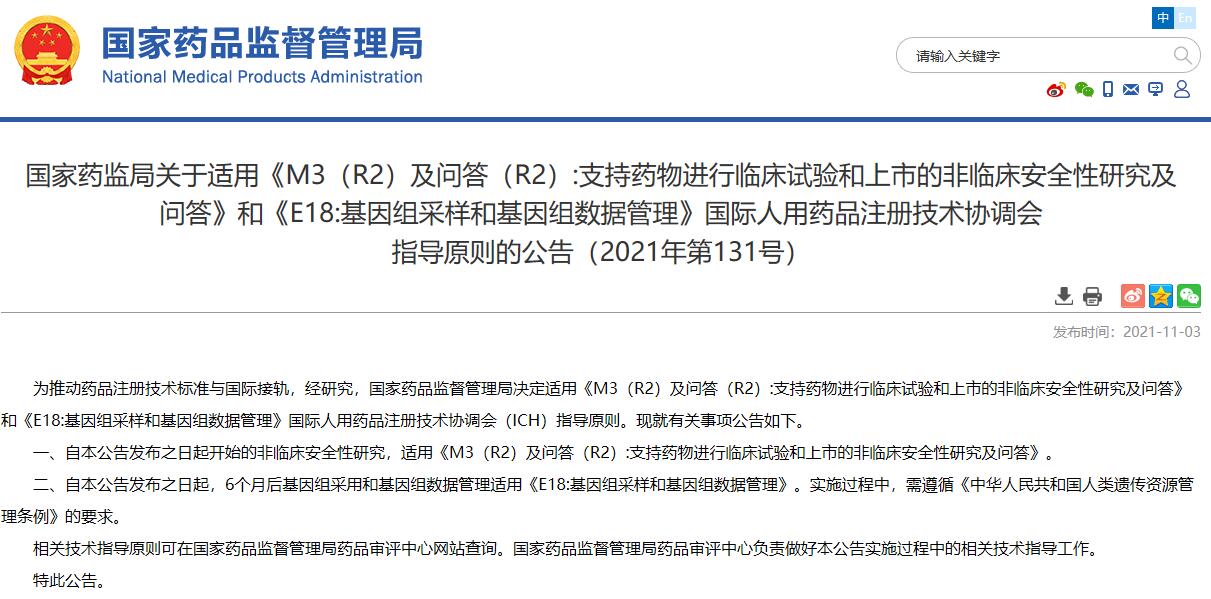 國家藥監局關于適用《M3(R2)及問答(R2):支持藥物進行臨床試驗和上市的非臨床安全性研究及問答》和《E18:基因組采樣和基因組數據管理》國際人用藥品注冊技術協調會指導原則的公告(2021年第131號)