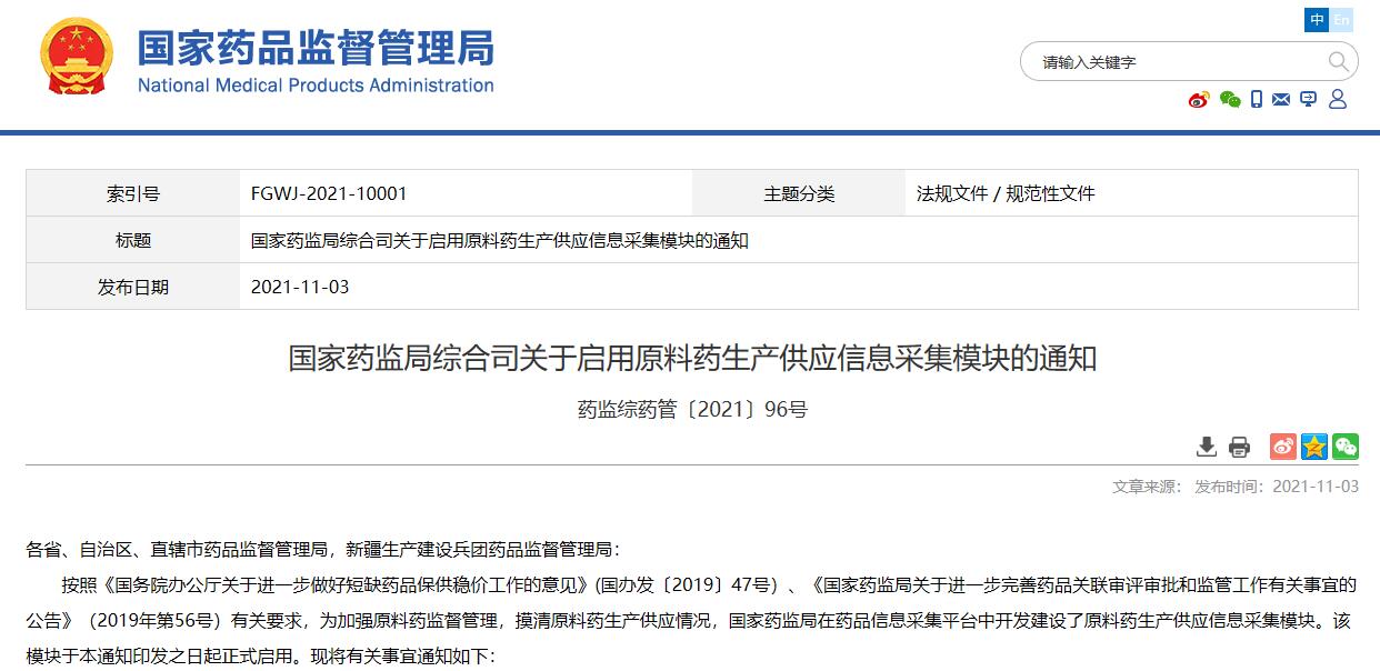 國家藥監局綜合司關于啟用原料藥生產供應信息采集模塊的通知
