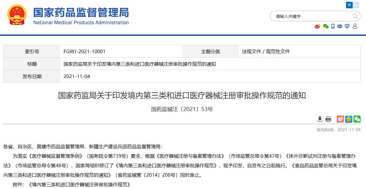 國家藥監局關于印發境內第三類和進口醫療器械注冊審批操作規范的通知