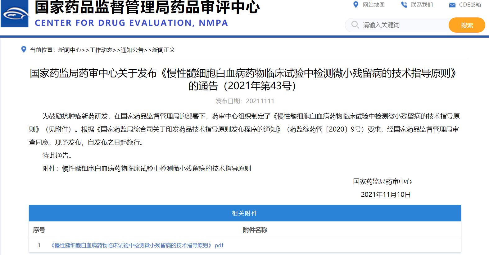 國家藥監(jiān)局藥審中心關(guān)于發(fā)布《慢性髓細(xì)胞白血病藥物臨床試驗(yàn)中檢測(cè)微小殘留病的技術(shù)指導(dǎo)原則》的通告