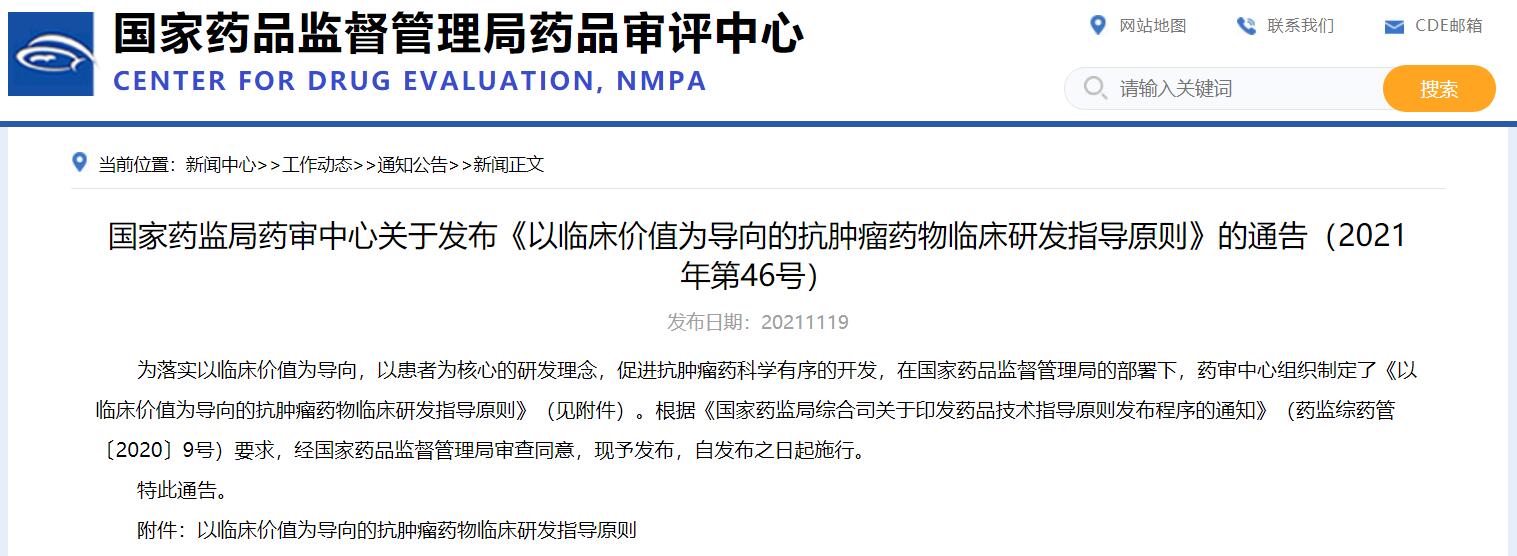 國家藥監局藥審中心關于發布《以臨床價值為導向的抗腫瘤藥物臨床研發指導原則》的通告(2021年第46號)