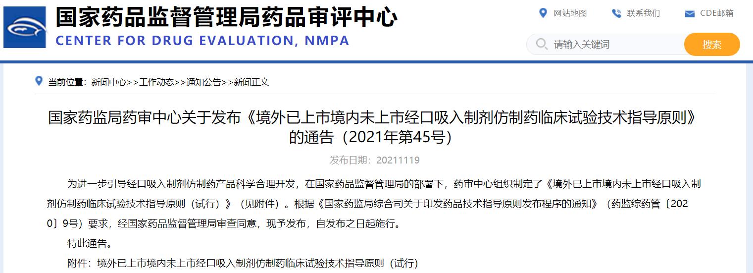 國家藥監局藥審中心關于發布《境外已上市境內未上市經口吸入制劑仿制藥臨床試驗技術指導原則》的通告(2021年第45號)