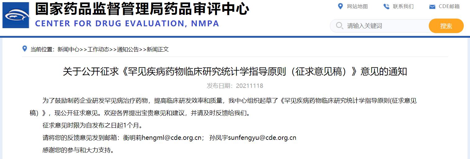 關于公開征求《罕見疾病藥物臨床研究統計學指導原則(征求意見稿)》意見的通知