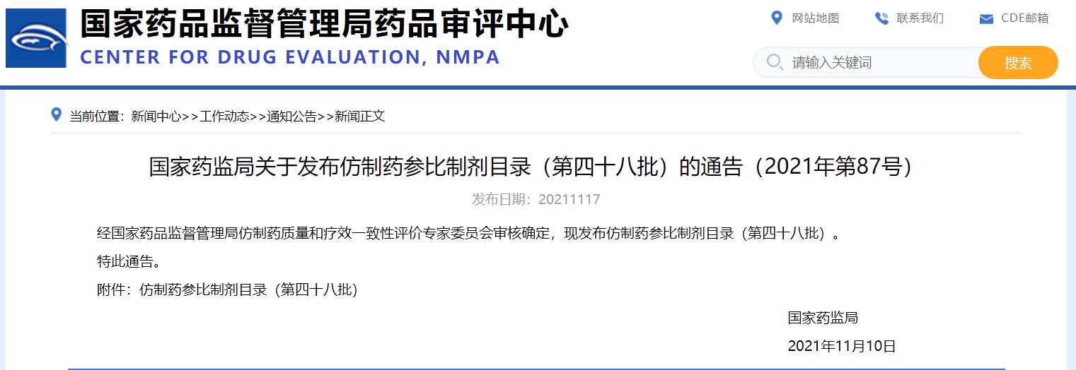 國家藥監局關于發布仿制藥參比制劑目錄(第四十八批)的通告(2021年第87號)