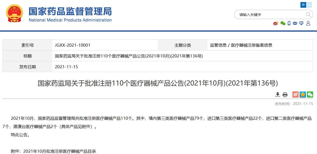 國家藥監局關于批準注冊110個醫療器械產品公告(2021年10月)(2021年第136號)