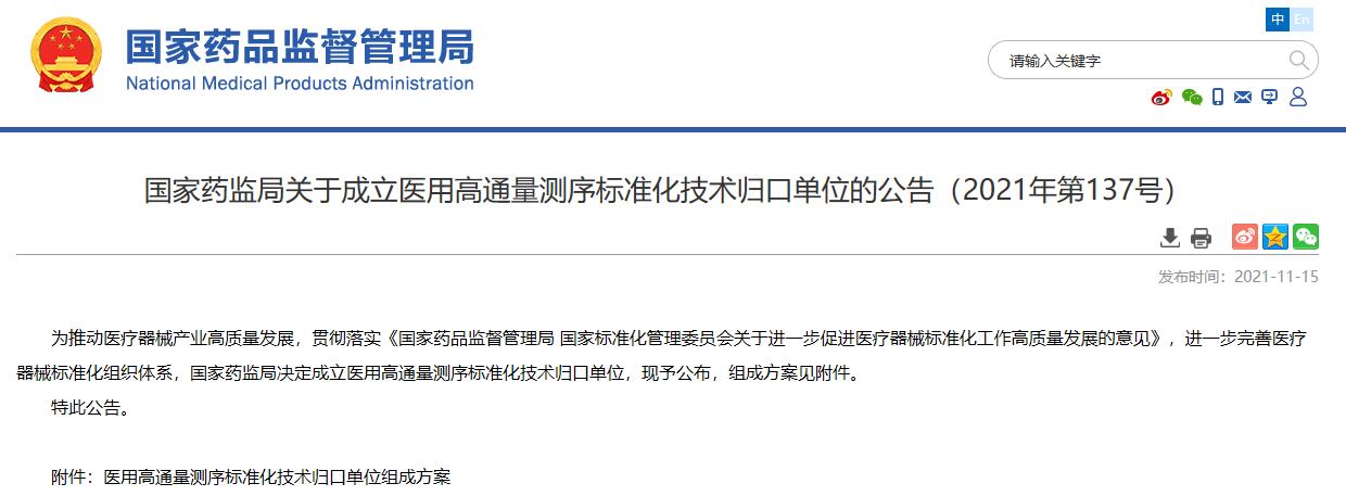 國家藥監局關于成立醫用高通量測序標準化技術歸口單位的公告(2021年第137號)