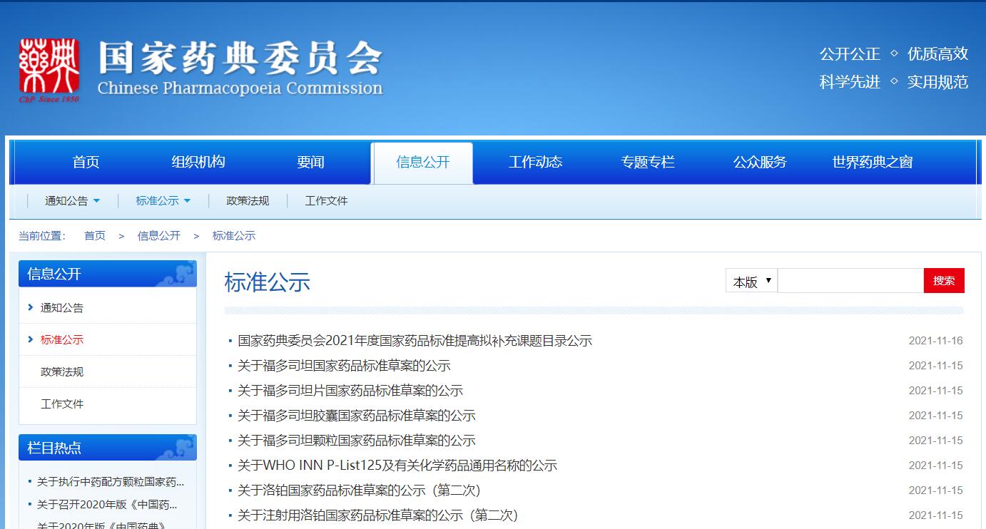 本周福多司坦、福多司坦片、福多司坦膠囊、福多司坦顆粒、洛鉑、注射用洛鉑國家藥品標準草案公示,WHO INN P-List125及有關化學藥品通用名稱的公示。