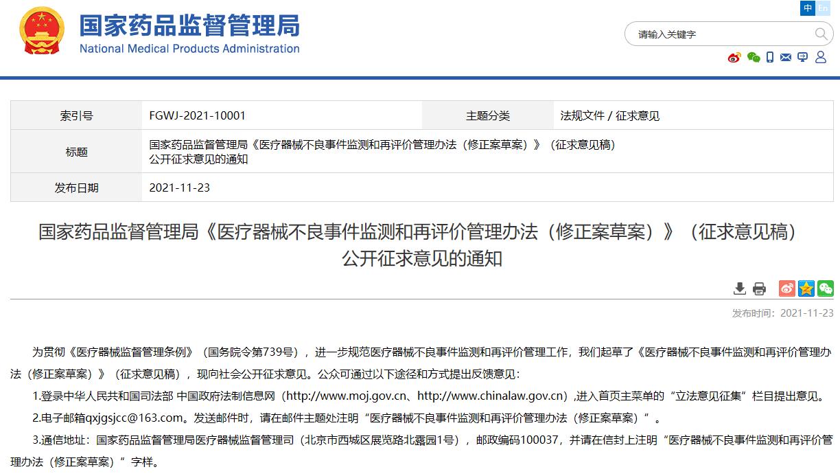 國家藥品監督管理局《醫療器械不良事件監測和再評價管理辦法(修正案草案)》(征求意見稿)公開征求意見的通知
