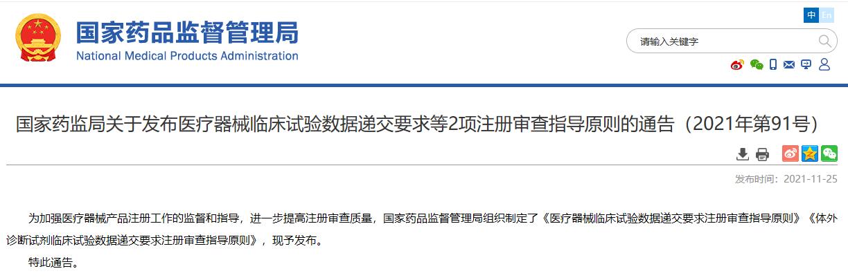 國家藥監局關于發布醫療器械臨床試驗數據遞交要求等2項注冊審查指導原則的通告(2021年第91號)