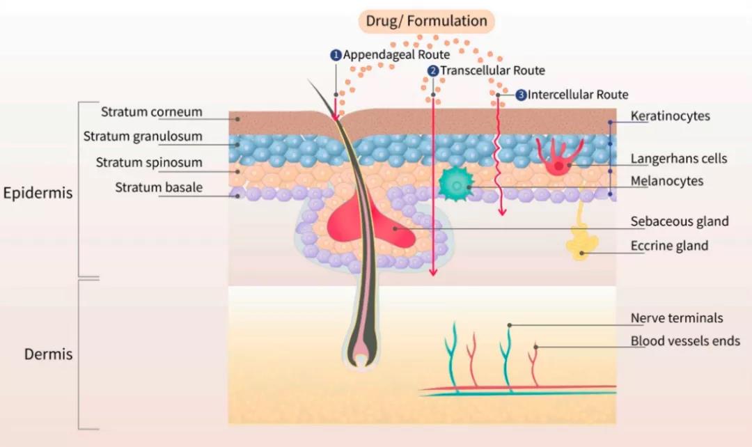 Figure1. 皮膚構造組成與透皮制劑的釋藥路徑