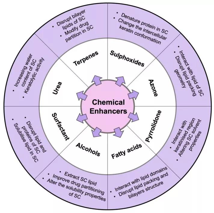圖5為我們展示了在化學促滲技術中較常使用的物質,包括醇類,脂肪酸,吡咯烷酮,氮酮,亞砜,表面活性劑,尿素和萜烯類化合物。這些化合物的作用機理常常是改變皮下組織的理化性質,比如改變水油分配比,改變磷脂層的結構,失活相應調控蛋白,進一步地,使得藥物活性成分進入人體吸收的比例增加[3]。