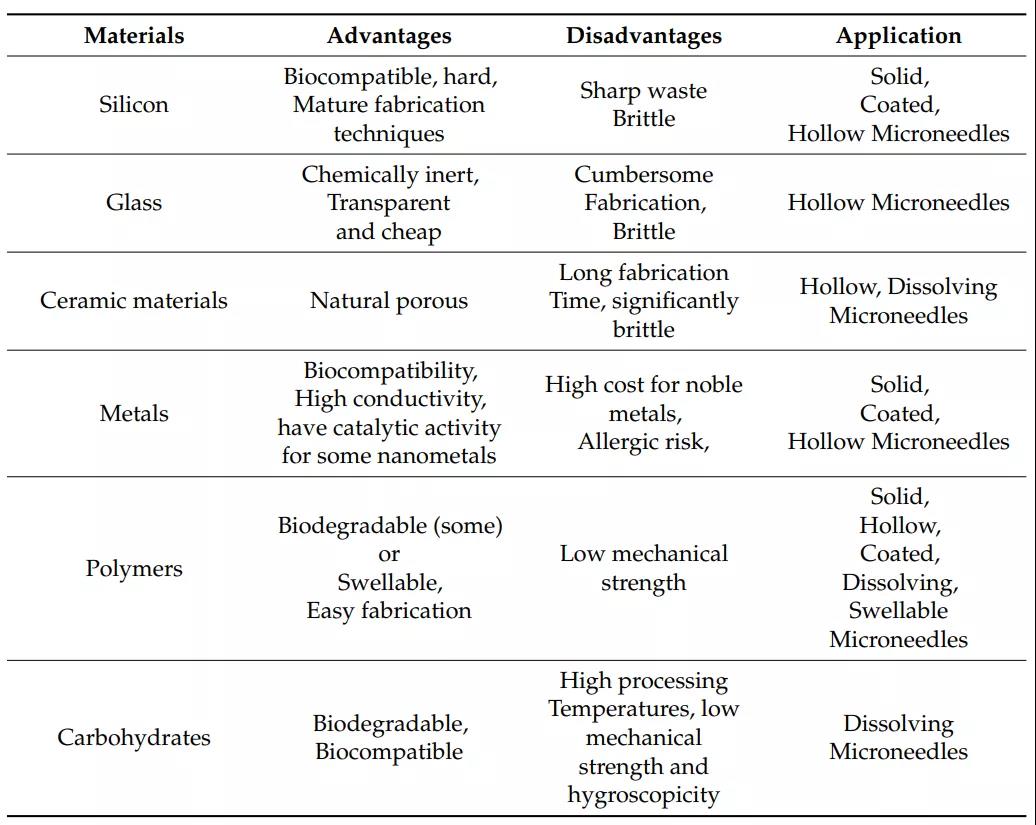 也有科學家將微針給藥系統分為固體微針,涂層微針,可溶性微針,水凝膠微針等。并詳細研究了微針和新型給藥載體如脂質體,納米顆粒,醇質體,囊泡結構結合的給藥方式。出于給藥安全性的考慮,科學家已經研究出了可生物降解的聚合物微針。聚合物微針通過聚乳酸,聚乙醇酸制備,具有良好的生物相容性、生物降解性。但與金屬微針相比,聚合物微針的強度較小,材料加工工藝有待提高。在圖6中為我們比較了不同材料制作微針的優劣特性[6]。