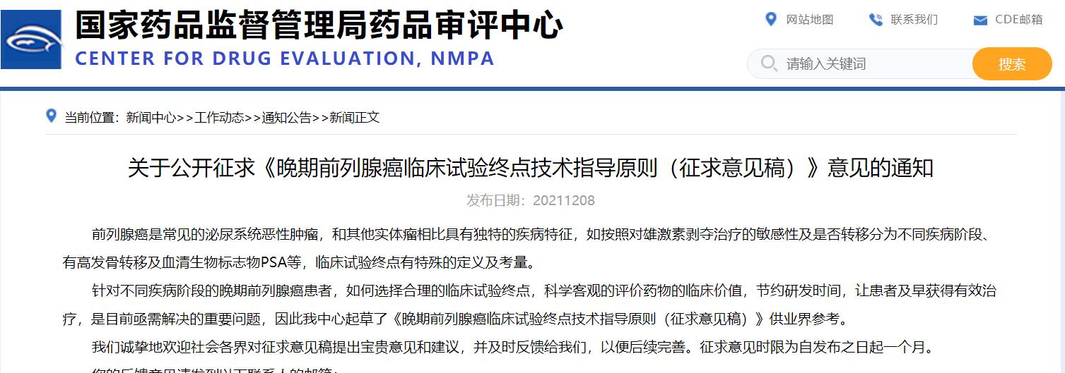 關于公開征求《晚期前列腺癌臨床試驗終點技術指導原則(征求意見稿)》意見的通知