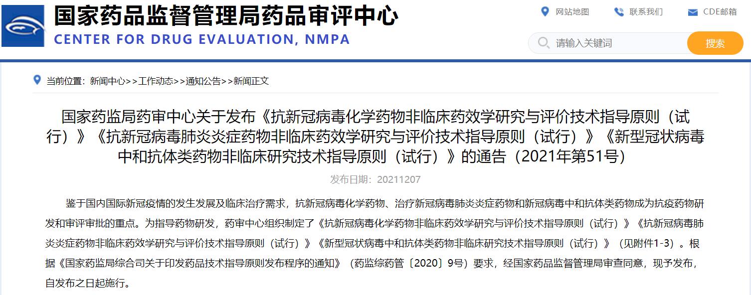 國家藥監局藥審中心關于發布《抗新冠病毒化學藥物非臨床藥效學研究與評價技術指導原則(試行)》《抗新冠病毒肺炎炎癥藥物非臨床藥效學研究與評價技術指導原則(試行)》《新型冠狀病毒中和抗體類藥物非臨床研究技術指導原則(試行)》的通告(2021年第51號)