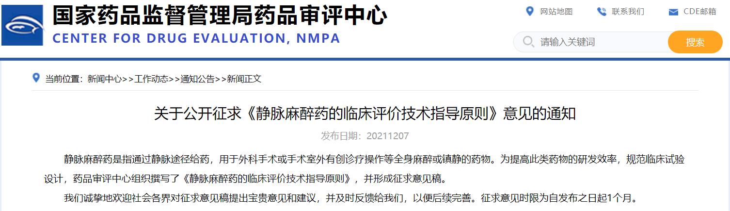 關于公開征求《靜脈麻醉藥的臨床評價技術指導原則》意見的通知