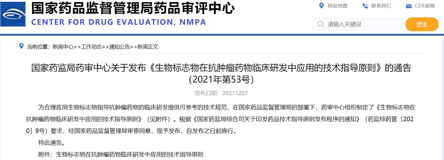 國家藥監局藥審中心關于發布《生物標志物在抗腫瘤藥物臨床研發中應用的技術指導原則》的通告(2021年第53號)