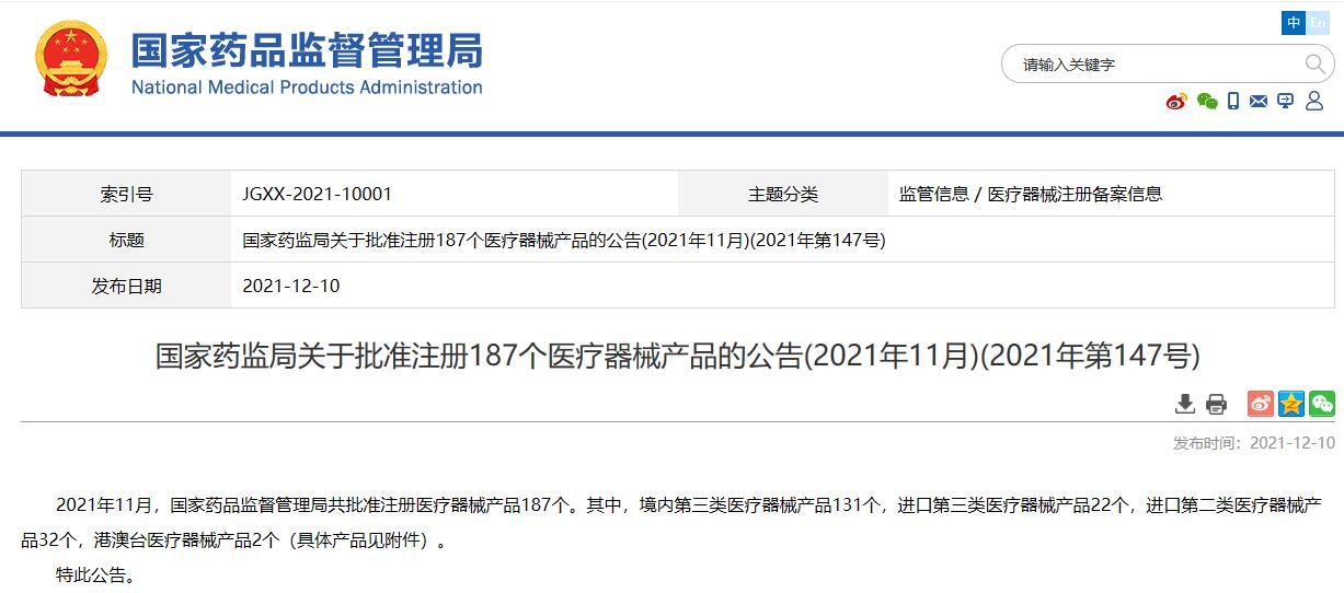 國家藥監局關于批準注冊187個醫療器械產品的公告(2021年11月)(2021年第147號)