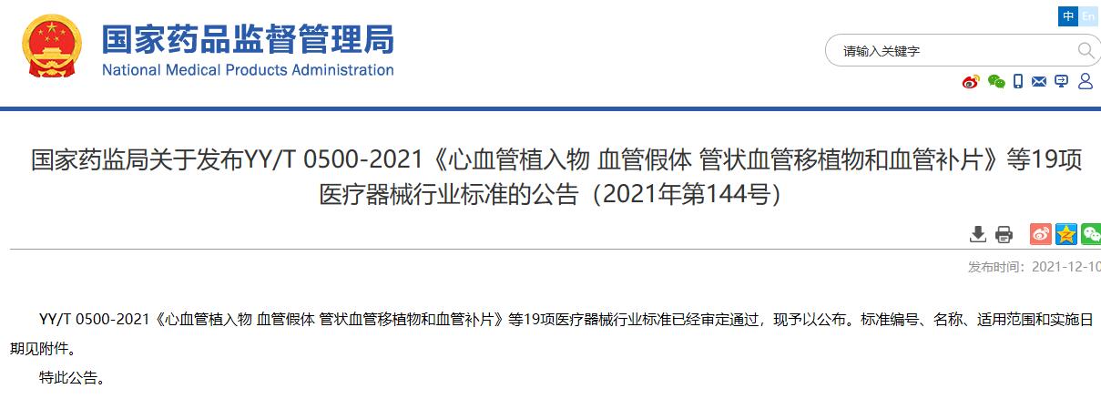 國家藥監局關于發布YY/T 0500-2021《心血管植入物 血管假體 管狀血管移植物和血管補片》等19項 醫療器械行業標準的公告(2021年第144號)