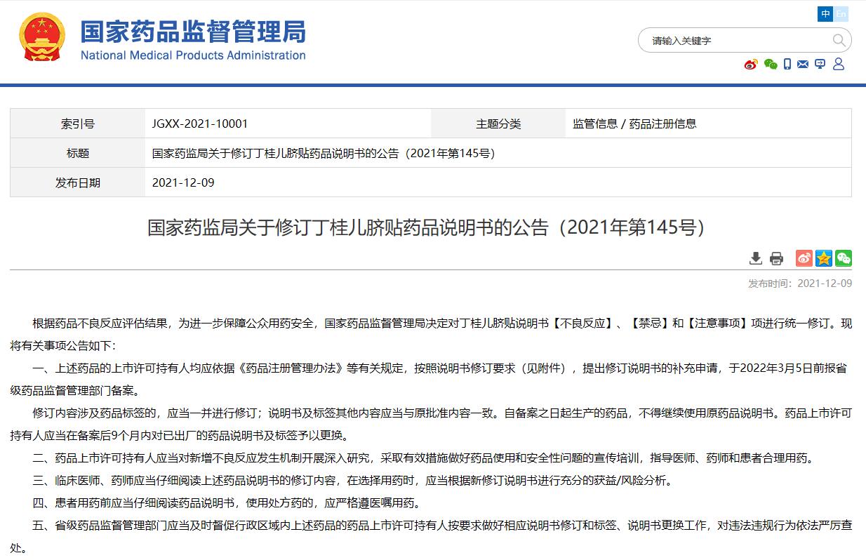 國家藥監局關于修訂丁桂兒臍貼藥品說明書的公告(2021年第145號)