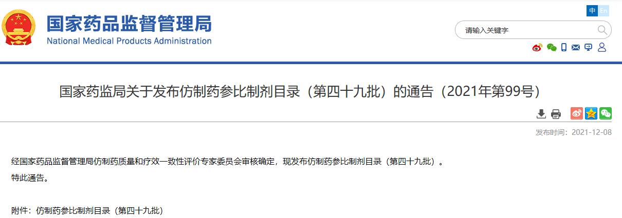 國家藥監局關于發布仿制藥參比制劑目錄(第四十九批)的通告(2021年第99號)