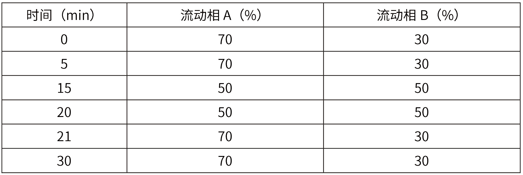 2)流動相A:10mmol/L磷酸二氫鉀溶液和2.5mmol/L庚烷磺酸鈉溶液(取磷酸二氫鉀1.36g,1-庚烷磺酸鈉0.51g,加水1000ml使溶解,用磷酸調節pH值至4.5)