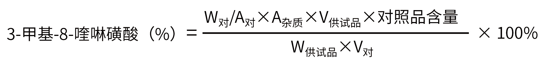注:W對:對照品溶液稱樣量,mg; W供試品:供試品稱樣量,mg; A對:對照品溶液色譜圖中3-甲基-8-喹啉磺酸峰面積; A雜質:供試品溶液色譜圖中3-甲基-8-喹啉磺酸峰面積; V對:對照品溶液的稀釋倍數; V供試品:供試品溶液的稀釋倍數。