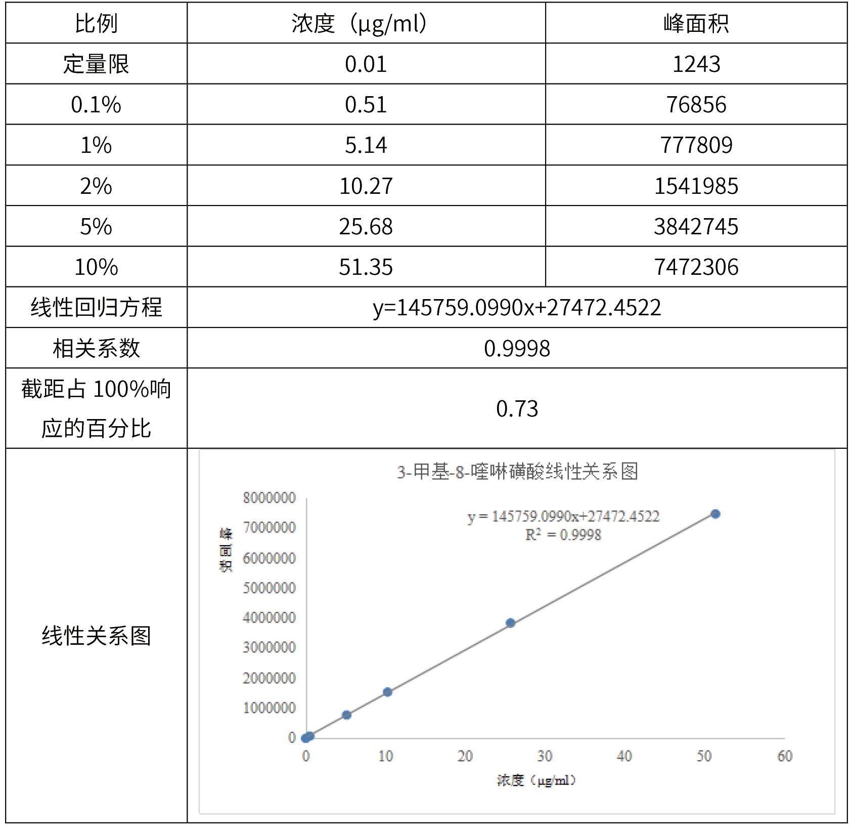 結論:3-甲基-8-喹啉磺酸在0.01~51.35μg/ml濃度范圍內,R2>0.999,濃度與峰面積之間線性關系良好。